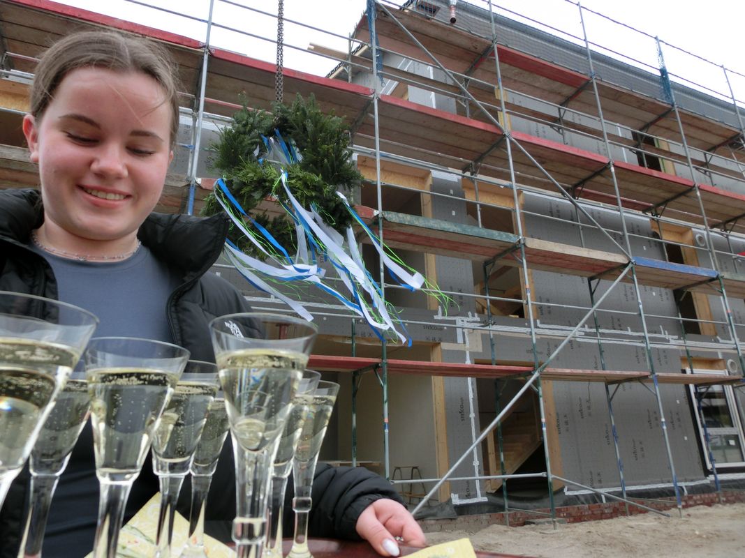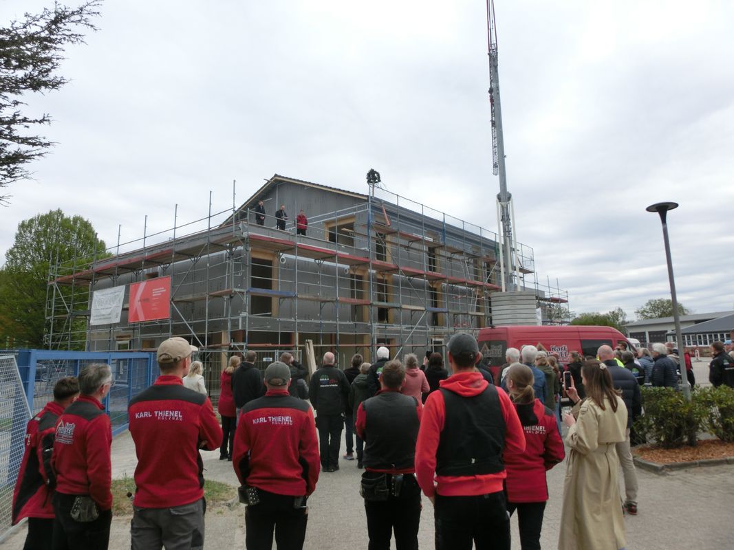Die veranschlagten 335 Kubikmeter Holz sind weitestgehend verbaut, sodass am 17. April dem neuen Gästehaus auf dem Gelände der DEULA Westerstede die Richtkrone aufgesetzt werden konnte.